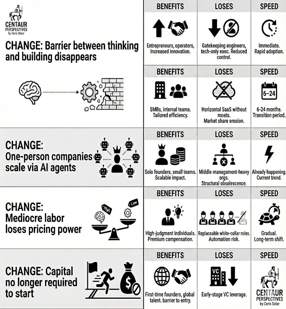 Entrepreneurs with real domain insight benefit. Operators who understand workflows benefit. Solo founders and small teams benefit. High judgment talent benefits.